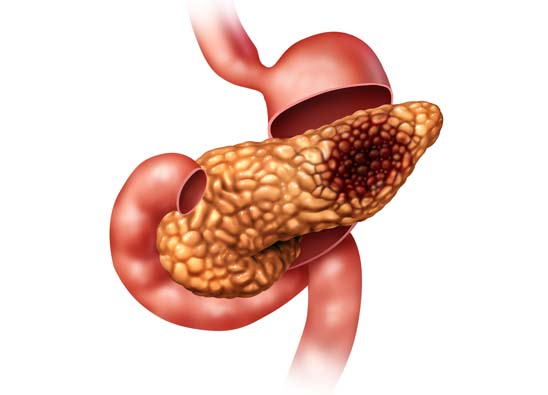 Cancer of the pancreas is the fourth leading cause of cancer death in the US. It has been called a “silent” disease because early pancreatic cancer usually does not cause symptoms. If the tumour blocks the common bile duct and bile cannot pass into the digestive system, the skin and whites of the eyes may become yellow, indicative of jaundice. As the cancer grows and spreads, pain often develops in the upper abdomen and sometimes spreads to the back. The pain may become worse after the person eats or lies down. Cancer of the pancreas can also cause nausea, loss of appetite, weight loss, and weakness.
